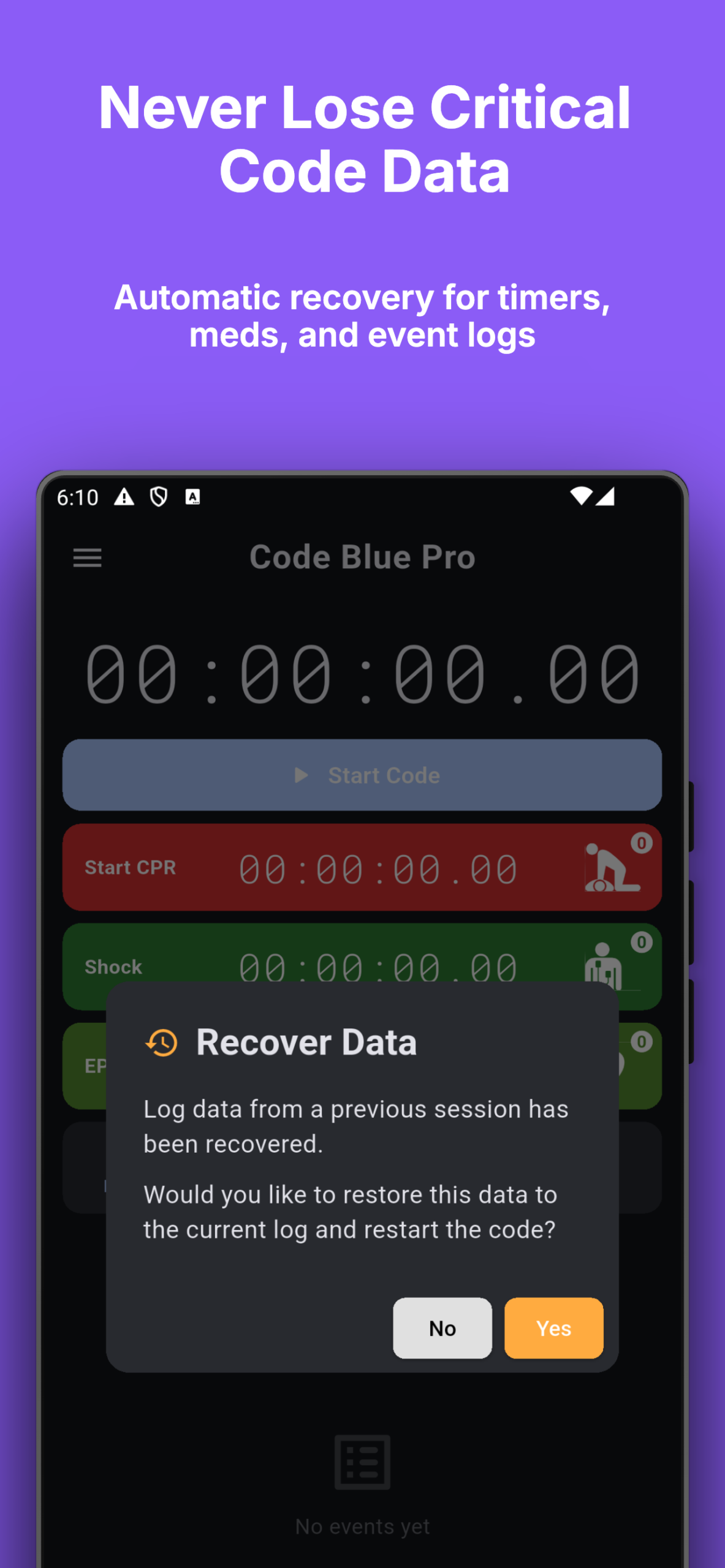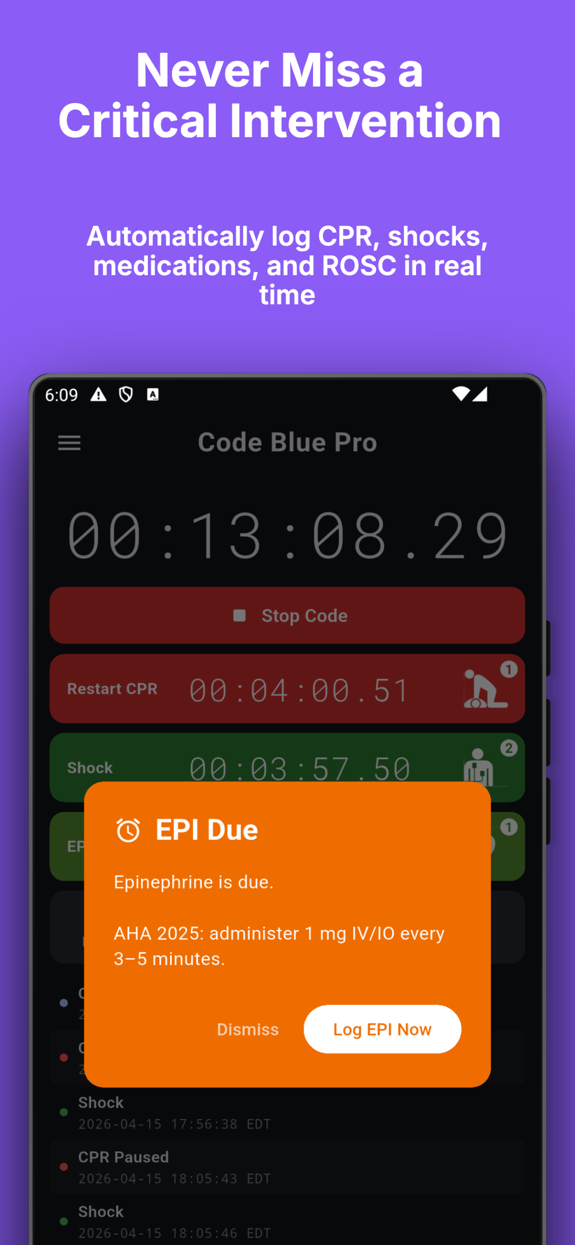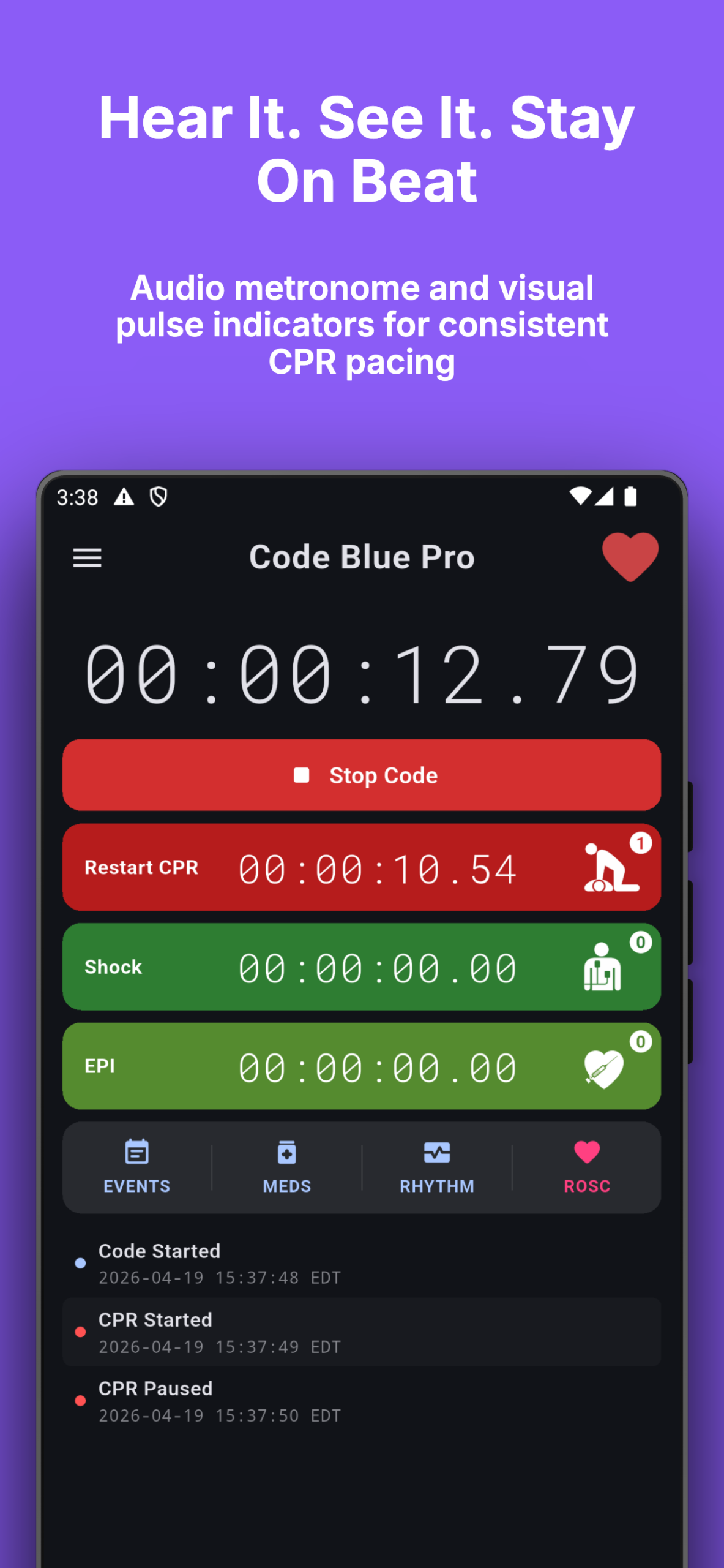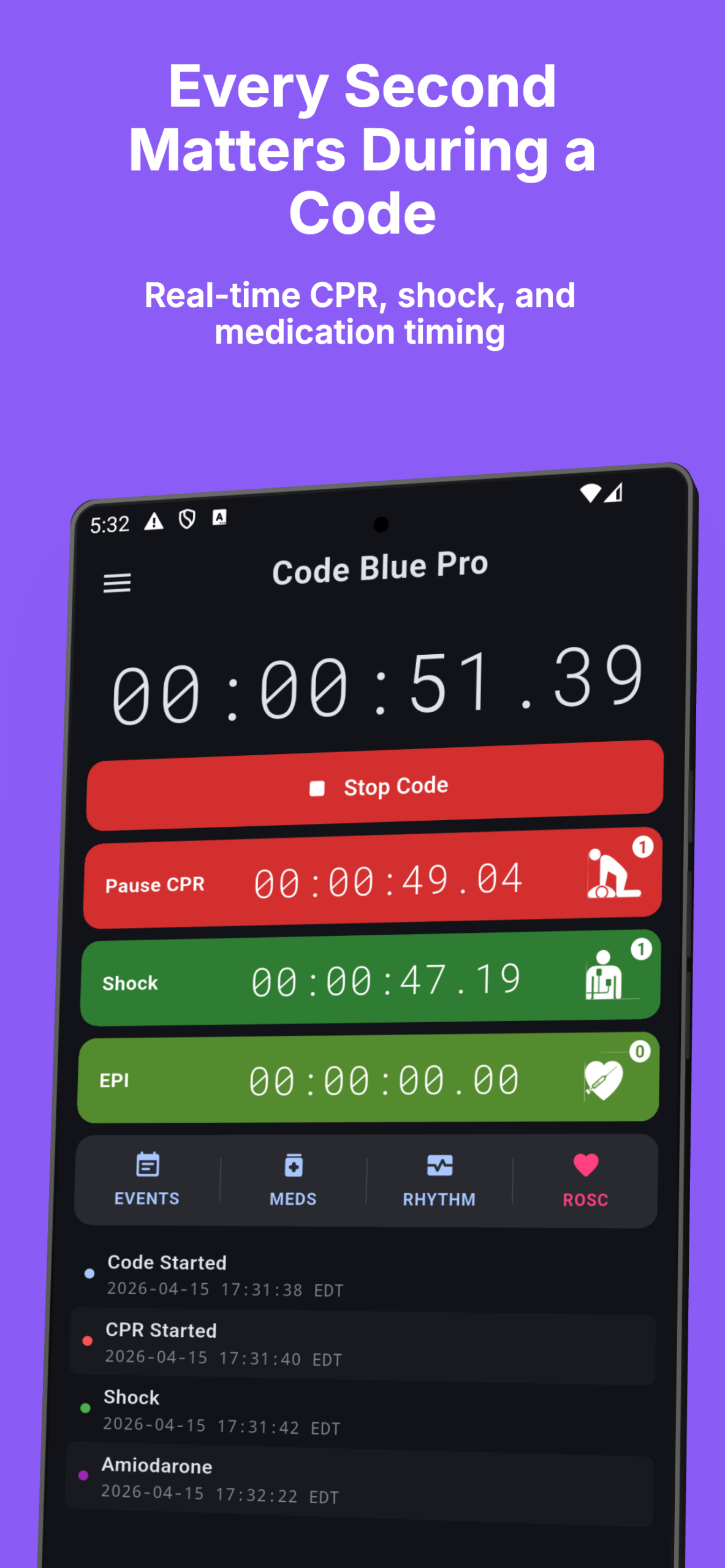 Code Blue is a specialized stopwatch application for Android and iOS that allows you to record the actions that take place during a cardiopulmonary event.